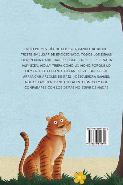 Descubre tus verdaderas fortalezas desde dentro y aprende a no compararte nunca con los demás. ¡El libro ilustrado perfecto para enseñar a tus hijos que todo el mundo es especial y que ser diferente es genial! Era el primer día de clase de Samuel y, en lugar de sentirse emocionado, se sentía triste y ansioso. Todos los demás animales de su clase tienen una habilidad especial. El pez Fred nada muy bien, la mona Molly es experta en trepar árboles y el elefante Eric es tan fuerte que puede arrancar árboles de raíz. Los demás niños parecían tener un talento especial, excepto el tigre Samuel. Parecía que no había nada en lo que el pequeño tigre fuera especialmente bueno. Samuel descubre lo equivocado que está en esta dulce y divertida aventura ilustrada. Es una historia profundamente auténtica y conmovedora sobre el hecho de que todos somos únicos y capaces. Una historia inspirada en la cita: Todo el mundo es un genio. Pero si juzgas a un pez por su talento para trepar a un árbol, pensará toda su vida que es estúpido. En esta historia, tu hijo descubrirá qué:¡Todo el mundo tiene un talento único que espera a ser descubierto! ¡Somos más fuertes cuando trabajamos juntos! Compararnos con los demás no sirve de nada. Hay un momento adecuado para todo. ¡Haz que el tiempo de lectura con tus pequeños sea más fructífero y especial! Tranquiliza, reconforta y calma su ansiedad y haz que se conviertan en adultos seguros de sí mismos y llenos de confianza. Observa cómo se desarrolla la historia a través de las hermosas ilustraciones y los diálogos conmovedores. Desplázate hacia arriba, haz clic en Comprar ahora y ¡comienza esta entrañable aventura con Samuel!