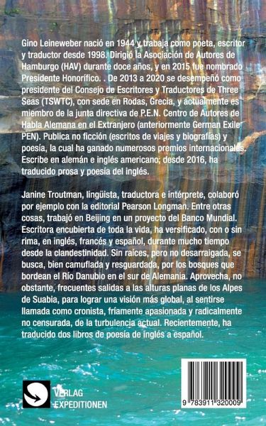 Gino Leineweber nació en 1944 y trabaja como poeta, escritor y traductor desde 1998. Dirigió la Asociación de Autores de Hamburgo (HAV) durante doce años, y en 2015 fue nombrado Presidente Honorífico. . De 2013 a 2020 se desempeñó como presidente del Consejo de Escritores y Traductores de Three Seas (TSWTC), con sede en Rodas, Grecia, y actualmente es miembro de la junta directiva de P.E.N. Centro de Autores de Habla Alemana en el Extranjero (anteriormente German Exile PEN). Publica no ficción (escritos de viajes y biografías) y poesía, la cual ha ganado numerosos premios internacionales. Escribe en alemán e inglés americano; desde 2016, ha traducido prosa y poesía del inglés. Janine Troutman, Lingüista, traductora e intérprete, colaboró por ejemplo con la editorial Pearson Longman. Entre otras cosas, trabajó en Beijing en un proyecto del Banco Mundial. Escritora encubierta de toda la vida, ha versificado, con o sin rima, en inglés, francés y español, durante mucho tiempo desde la clandestinidad. Sin raíces, pero no desarraigada, se busca, bien camuflada y resguardada, por los bosques que bordean el Río Danubio en el sur de Alemania. Aprovecha, no obstante, frecuentes salidas a las alturas planas de los Alpes de Suabia, para lograr una visión más global, al sentirse llamada como cronista, fríamente apasionada y radicalmente no censurada, de la turbulencia actual. Recientemente, ha traducido dos libros de poesía de inglés a español.
