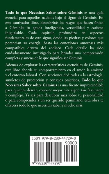 Todo lo que Necesitas Saber sobre Géminis es una guía esencial para aquellos nacidos bajo el signo de Géminis. En este cautivador libro, descubrirás los rasgos que hacen único a Géminis: su aguda inteligencia, versatilidad y carisma inigualable. Cada capítulo profundiza en aspectos fundamentales de este signo, desde las piedras y colores que potencian su energía, hasta las conexiones amorosas más compatibles dentro del zodiaco. Cada detalle ha sido cuidadosamente investigado para brindar una comprensión completa y amena de lo que significa ser Géminis. Además de explorar las características esenciales de Géminis, este libro aborda su comportamiento en el amor, la amistad y el entorno laboral. Con secciones dedicadas a la astrología, amuletos de protección y consejos prácticos, Todo lo que Necesitas Saber sobre Géminis es una fuente imprescindible para quienes desean conocer mejor este signo tan fascinante y complejo. Ya sea para descubrir más sobre tu personalidad o para comprender a un ser querido geminiano, esta obra te ofrecerá todo lo que necesitas saber y mucho más.