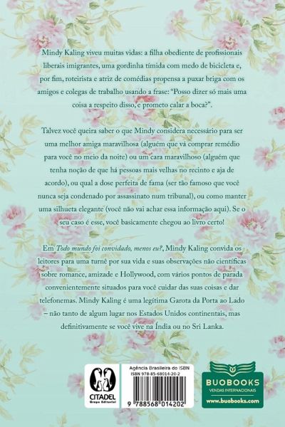Mindy Kaling viveu muitas vidas: a filha obediente de profissionais liberais imigrantes, uma gordinha tímida com medo de bicicleta e, por fim, roteirista e atriz de comédias propensa a puxar briga com os amigos e colegas de trabalho usando a frase: ¿Posso dizer só mais uma coisa a respeito disso, e prometo calar a boca?¿. Talvez você queira saber o que Mindy considera necessário para ser uma melhor amiga maravilhosa (alguém que vá comprar remédio para você no meio da noite) ou um cara maravilhoso (alguém que tenha noção de que há pessoas mais velhas no recinto e aja de acordo), ou qual a dose perfeita de fama (ser tão famoso que você nunca seja condenado por assassinato num tribunal), ou como manter uma silhueta elegante (você não vai achar essa informação aqui). Se o seu caso é esse, você basicamente chegou ao livro certo! Em Todo mundo foi convidado, menos eu?, Mindy Kaling convida os leitores para uma turnê por sua vida e suas observações não científicas sobre romance, amizade e Hollywood, com vários pontos de parada convenientemente situados para você cuidar das suas coisas e dar telefonemas. Mindy Kaling é uma legítima Garota da Porta ao Lado ¿ não tanto de algum lugar nos Estados Unidos continentais, mas definitivamente se você vive na Índia ou no Sri Lanka.