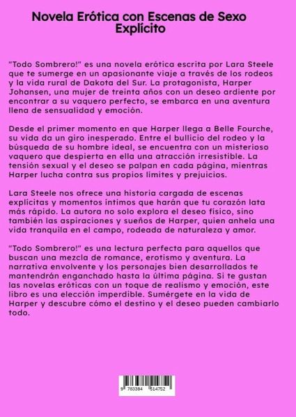 "Todo Sombrero!" es una novela erótica escrita por Lara Steele que te sumerge en un apasionante viaje a través de los rodeos y la vida rural de Dakota del Sur. La protagonista, Harper Johansen, una mujer de treinta años con un deseo ardiente por encontrar a su vaquero perfecto, se embarca en una aventura llena de sensualidad y emoción.Desde el primer momento en que Harper llega a Belle Fourche, su vida da un giro inesperado. Entre el bullicio del rodeo y la búsqueda de su hombre ideal, se encuentra con un misterioso vaquero que despierta en ella una atracción irresistible. La tensión sexual y el deseo se palpan en cada página, mientras Harper lucha contra sus propios límites y prejuicios.Lara Steele nos ofrece una historia cargada de escenas explícitas y momentos íntimos que harán que tu corazón lata más rápido. La autora no solo explora el deseo físico, sino también las aspiraciones y sueños de Harper, quien anhela una vida tranquila en el campo, rodeada de naturaleza y amor."Todo Sombrero!" es una lectura perfecta para aquellos que buscan una mezcla de romance, erotismo y aventura. La narrativa envolvente y los personajes bien desarrollados te mantendrán enganchado hasta la última página. Si te gustan las novelas eróticas con un toque de realismo y emoción, este libro es una elección imperdible. Sumérgete en la vida de Harper y descubre cómo el destino y el deseo pueden cambiarlo todo.