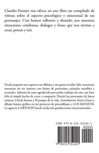 Claudio Furnier nos ofrece en este libro un compilado de viñetas sobre el aspecto psicológico y emocional de sus personajes. Con humor reflexivo y absurdo, nos muestras situaciones cotidianas, diálogos y frases que nos invitan a crear, pensar y reír.
