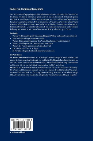 Wie Töchternachfolge gelingt und wie Familienunternehmen zukünftig durch weibliche Nachfolge profitieren können, zeigt dieses Buch eindrucksvoll auf. 30 Einzelporträts geben Einblick in Nachfolge- und Führungsstrategien von Deutschlands erfolgreichsten Familienunternehmerinnen. Neben praktischen Umsetzungstipps bietet das Werk wissenschaftliche Erkenntnisse aus einer Studie zur weiblichen Unternehmensübernahme. Eine unentbehrliche Lektüre für alle, die sich für Familienunternehmen und weibliche Führung interessieren. Mit einem Vorwort von Rosely Schweizer, geb. Oetker.