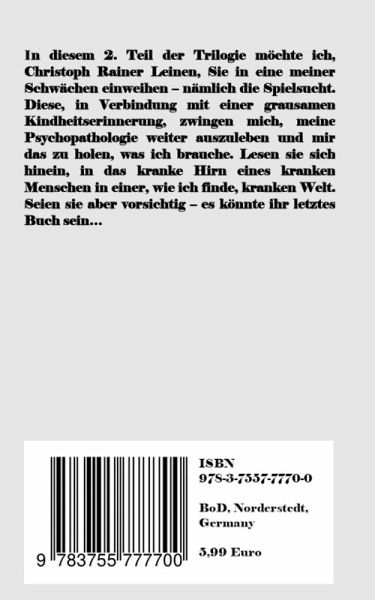 In diesem 2. Teil der Trilogie möchte ich, Christoph Rainer Leinen, Sie in eine meiner Schwächen einweihen - nämlich die Spielsucht. Diese, in Verbindung mit einer grausamen Kindheitserinnerung, zwingen mich, meine Psychopathologie weiter auszuleben und mir das zu holen, was ich brauche. Lesen sie sich hinein, in das kranke Hirn eines kranken Menschen in einer, wie ich finde, kranken Welt. Seien sie aber vorsichtig - es könnte ihr letztes Buch sein...