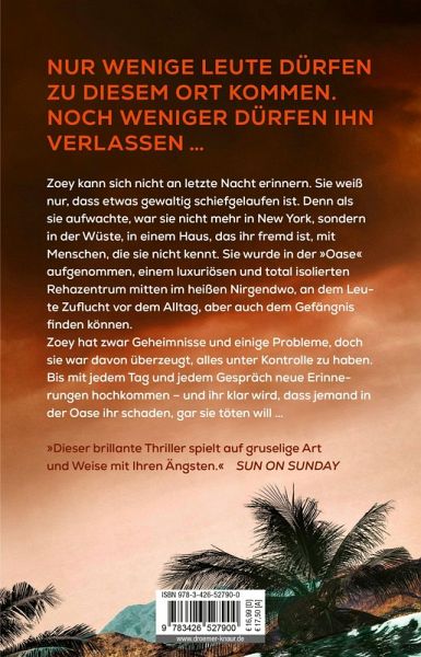 Zoey wurde in der Oase aufgenommen, einem luxuriösen und total isolierten Rehazentrum mitten im unerträglich heißen Nirgendwo. Dort findet man Zuflucht vor dem Alltag - oder vor dem Gefängnis. Zoey hat zwar ihre Geheimnisse und das ein oder andere Problem, trotzdem ist sie davon überzeugt, alles unter Kontrolle zu haben. Bis mit jedem Tag und jedem Gespräch neue Erinnerungen hochkommen. Schließlich muss Zoey erkennen, dass jemand in der Oase ihr schaden und sie offenbar sogar töten will ...