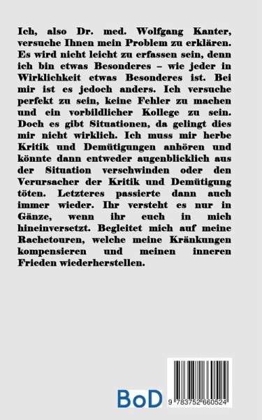 Ich, also Dr. med. Wolfgang Kanter, versuche Ihnen mein Problem zu erklären. Es wird nicht leicht zu erfassen sein, denn ich bin etwas Besonderes - wie jeder in Wirklichkeit etwas Besonderes ist. Bei mir ist es jedoch anders. Ich versuche perfekt zu sein, keine Fehler zu machen und ein vorbildlicher Kollege zu sein. Doch es gibt Situationen, da gelingt dies mir nicht wirklich. Ich muss mir herbe Kritik und Demütigungen anhören und könnte dann entweder augenblicklich aus der Situation verschwinden oder den Verursacher der Kritik und Demütigung töten. Letzteres passierte dann auch immer wieder. Ihr versteht es nur in Gänze, wenn ihr euch in mich hineinversetzt. Begleitet mich auf meine Rachetouren, welche meine Kränkungen kompensieren und meinen inneren Frieden wiederherstellen.