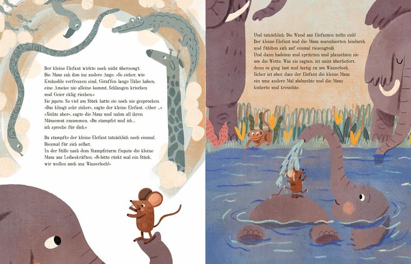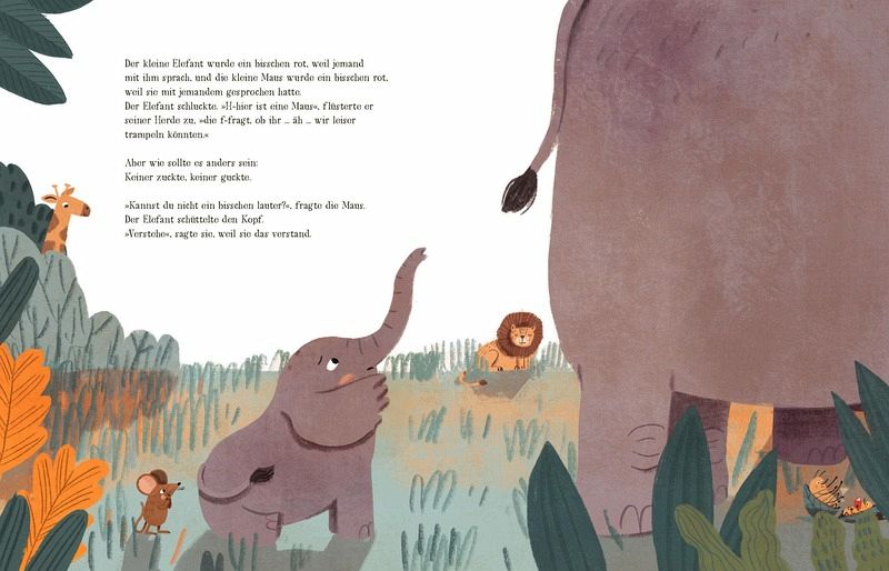 Der kleine Elefant und die Maus haben ein Problem, sie kommen gegen das laute Getröte der Elefantenherde einfach nicht an! Mit ihrer fiepsig-leisen Stimme kann sich die Maus einfach kein Gehör verschaffen und der kleine Elefant ist zwar viel größer als die Maus, aber er traut sich nicht, mal so richtig laut zu trompeten. Doch zum Glück unterstützen sich beide gegenseitig und können sich durchsetzen.