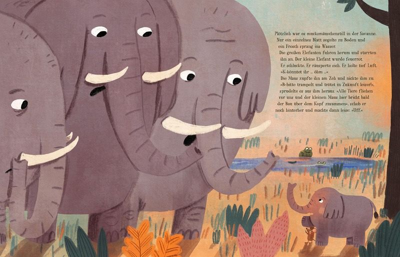 Die Maus hört jeden Tag, wenn die Elefantenherde durch die Savanne zum Wasserloch wandert, denn das wird nicht nur von lautem Töröööö begleitet, sondern auch mit reichlich Gestampfe, das den Erdboden und damit den Mäusebau darunter erschüttert. Die Maus fürchtet sich, dass irgendwann der Boden über ihr einbricht. Deshalb läuft sie hinter der Elefantenherde her, um sich zu beschweren. Doch mit ihrer kleinen, feinen Stimme kann sie sich einfach kein Gehör verschaffen. Da bemerkt sie den kleinen Elefanten, von dem niemand Notiz nimmt, während er versucht, an den großen Elefanten vorbei zum Wasserloch zu gelangen. Die Maus ist schlau und überzeugt den Elefanten schliesslich, mit dem Fuß aufzustampfen, ganz laut und immer wieder, bis die anderen Elefanten ihn bemerken.