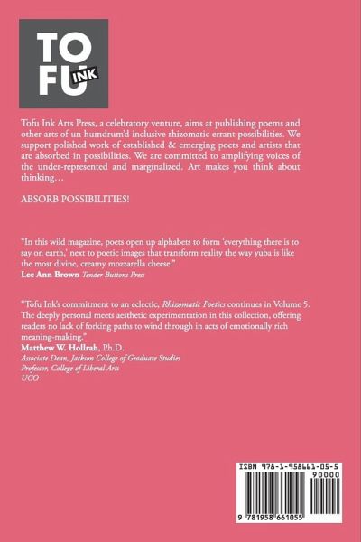 Tofu Ink Arts Press, a celebratory venture aims at publishing poems and other arts of un humdrum'd inclusive rhizomatic errant possibilities. We support work of established and emerging poets and artists. We strive for tri annual issues. We are looking for polished art and poetics that are absorbed in possibilities. We are committed to amplifying voices of the under-represented and marginalized. Tofu Ink Arts Press is a member of CLMP, Poets & Writers, Association of Writers & Writing Programs and The Academy of American Poets. Art makes you think about thinking...ABSORB POSSIBILITIES!