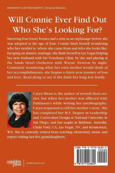 Born as an illegitimate child, Connie survives four foster homes and a stint in an orphanage before she is adopted at the age of four. Hearing other people say, "You look just like your mother." Connie longs to know who she looks like. When she is fifteen, her adopted father provides her with descriptions and backgrounds of her biological parents provided by the Adoption agency, asking her not to search until after he has died. Becoming an extraordinary musician, Connie forgoes a music scholarship to Gustavus Adolphus, to pursue a medical education which was thwarted by her evil stepmother. Marrying early, and not having the opportunity to continue her education, she raises three children with a controlling husband. Without having a mother of her own, she encounters unique experiences as she ventures through life on the farm, feeding hired hands and working at the hospital. Entering the Mrs. Minnesota competition, she earns the title in 1965-66, and goes on to compete for the Mrs. America title. Escaping an abusive marriage, Connie remarries and joins her new husband in Las Vegas, NV, where she becomes the office manager for his Veterinary clinic by day, and uses her musical talents, playing at the Sands Hotel with Wayne Newton by night. The thought of what her mother might think of her accomplishments never leaves her, and once her father dies, Connie begins the search for her relatives. Once the birth records are opened in Minnesota, Connie is put in touch with her biological father who was living in Phoenix. From there her search turns into a thirty-year long endeavor trying to find her biological mother. Viola Lundberg changed not only her last name through marriage, but also her first name, so it was like looking for a needle in a haystack until her relatives came looking for Connie through the Little Red Stocking adoption agency in Minnesota! They were looking for Connie. Eventually she discovers she is not an only child given up for adoption, but
