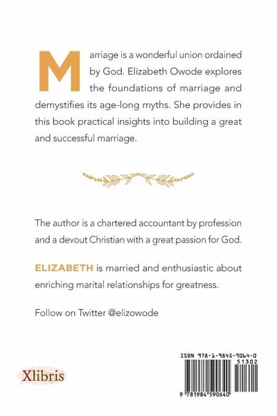Marriage is a wonderful union ordained by God. Elizabeth Owode explores the foundations of marriage and demystifies its age-long myths. She provides in this book practical insights into building a great and successful marriage.