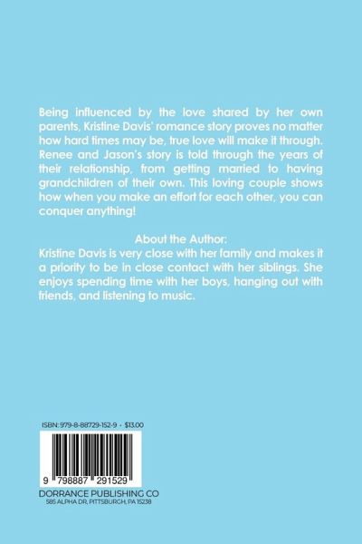 Being influenced by the love shared by her own parents, Kristine Davis' romance story proves no matter how hard times may be, true love will make it through. Renee and Jason's story is told through the years of their relationship, from getting married to having grandchildren of their own. This loving couple shows how when you make an effort for each other, you can conquer anything! About the Author Kristine Davis is very close with her family and makes it a priority to be in close contact with her siblings. She enjoys spending time with her boys, hanging out with friends, and listening to music.