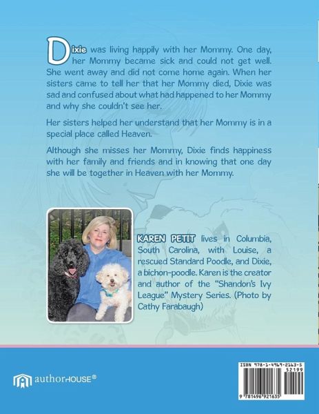 Dixie was living happily with her Mommy. One day, her Mommy became sick and could not get well. She went away and did not come home again. When her sisters came to tell her that her Mommy died, Dixie was sad and confused about what had happened to her Mommy and why she couldn?t see her. Her sisters helped her understand that her Mommy is in a special place called Heaven. Although she misses her Mommy, Dixie finds happiness with her family and friends and in knowing that one day she will be together in Heaven with her Mommy.