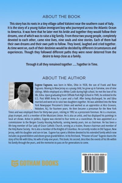 This story has its roots in a tiny village called Valsinni near the southern coast of Italy. It is the story of a young Italian immigrant boy who journeyed across the Atlantic Ocean to America. It was here that he later met his bride and together they would follow their dreams, one of which was to raise a big family. From these two young people, completely devoted to each other, came nine lives, nine souls and nine stories. Each of them had their own dreams and their own path to follow. They loved, laughed and cried together. As time went on, each of their destinies would be decided by different circumstances and experiences. Though they followed different paths they were never deterred from the desire to keep close as a family. Through it all they remained together..... Together in Time.