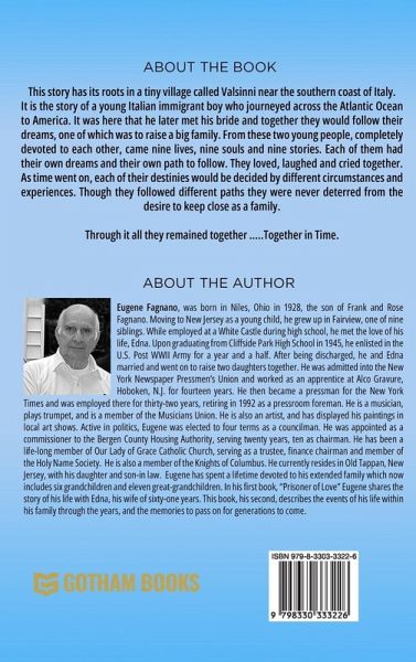 This story has its roots in a tiny village called Valsinni near the southern coast of Italy. It is the story of a young Italian immigrant boy who journeyed across the Atlantic Ocean to America. It was here that he later met his bride and together they would follow their dreams, one of which was to raise a big family. From these two young people, completely devoted to each other, came nine lives, nine souls and nine stories. Each of them had their own dreams and their own path to follow. They loved, laughed and cried together. As time went on, each of their destinies would be decided by different circumstances and experiences. Though they followed different paths they were never deterred from the desire to keep close as a family. Through it all they remained together..... Together in Time.