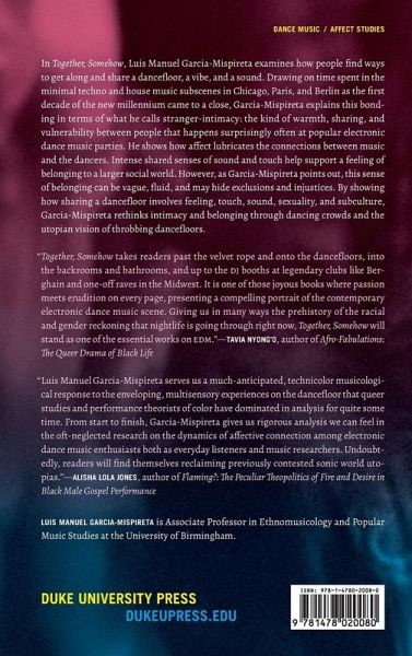 In Together, Somehow, Luis Manuel Garcia-Mispireta examines how people find ways to get along and share a dancefloor, a vibe, and a sound. Drawing on time spent in the minimal techno and house music subscenes in Chicago, Paris, and Berlin as the first decade of the new millennium came to a close, Garcia-Mispireta explains this bonding in terms of what he calls stranger-intimacy: the kind of warmth, sharing, and vulnerability between people that happens surprisingly often at popular electronic dance music parties. He shows how affect lubricates the connections between music and the dancers. Intense shared senses of sound and touch help support a feeling of belonging to a larger social world. However, as Garcia-Mispireta points out, this sense of belonging can be vague, fluid, and may hide exclusions and injustices. By showing how sharing a dancefloor involves feeling, touch, sound, sexuality, and subculture, Garcia-Mispireta rethinks intimacy and belonging through dancing crowds and the utopian vision of throbbing dancefloors.