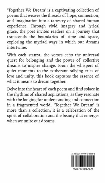 "Together We Dream" is a captivating collection of poems that weaves the threads of hope, connection, and imagination into a tapestry of shared human experience. Through vivid imagery and lyrical grace, the poet invites readers on a journey that transcends the boundaries of time and space, exploring the myriad ways in which our dreams intertwine. With each stanza, the verses echo the universal quest for belonging and the power of collective dreams to inspire change. From the whispers of quiet moments to the exuberant rallying cries of love and unity, this book captures the essence of what it means to dream together. Delve into the heart of each poem and find solace in the rhythms of shared aspirations, as they resonate with the longing for understanding and connection in a fragmented world. "Together We Dream" is more than a collection; it is a celebration of the spirit of collaboration and the beauty that emerges when we unite our dreams.