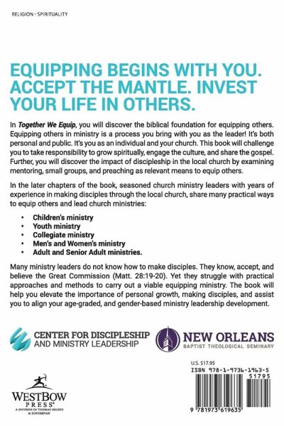 In Together We Equip, you will discover the biblical foundation for equipping others. Equipping others in ministry is a process you bring with you as the leader! Its both personal and public. Its you as an individual and your church. This book will challenge you to take responsibility to grow spiritually, engage the culture, and share the gospel. Further, you will discover the impact of discipleship in the local church by examining mentoring small groups and preaching as relevant means to equip others. In the later chapters of the book, seasoned church ministry leaders with years of experience in making disciples through equipping ministry of the local church share many practical ways to equip others and lead church ministries: childrens ministry youth ministry collegiate ministry mens and womens ministry adult and senior adult ministries. Many ministry leaders do not know how to make disciples. They know, accept, and believe the Great Commission (Matt. 28: 1920). Yet they struggle with practical approaches and methods to carry out a viable equipping ministry. The book will help you elevate the importance of personal growth, making disciples, and assist you to align your age-graded and gender-based ministry leadership development.