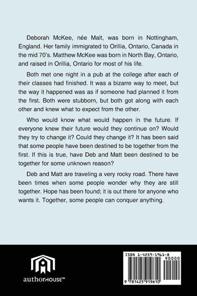Deborah McKee, née Malt, was born in Nottingham, England. Her family immigrated to Orillia, Ontario, Canada in the mid 70's. Matthew McKee was born in North Bay, Ontario, and raised in Orillia, Ontario for most of his life. Both met one night in a pub at the college after each of their classes had finished. It was a bizarre way to meet, but the way it happened was as if someone had planned it from the first. Both were stubborn, but both got along with each other and knew what to expect from the other. Who would know what would happen in the future. If everyone knew their future would they continue on? Would they try to change it? Could they change it? It has been said that some people have been destined to be together from the first. If this is true, have Deb and Matt been destined to be together for some unknown reason? Deb and Matt are traveling a very rocky road. There have been times when some people wonder why they are still together. Hope has been found; it is out there for anyone who wants it. Together, some people can conquer anything.