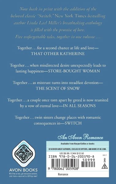 A romance collection includes the previously unpublished novella, "In All Seasons," and the short tales?"That Other Katherine," "Store-Bought Woman" and "The Scent of Snow, as well as a story new to this edition, "Switch." By a New York Times best-selling author. Reissue. 400,000 first printing.