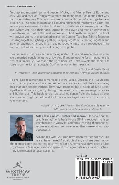 Ketchup and mustard. Salt and pepper. Mickey and Minnie. Peanut Butter and Jelly. Milk and cookies. Things were meant to be together. God made it that way. He made us that way. This book is written to a specific part of your togetherness experience. The most intimate and enduring relationship you have on earth. The person you are married to. Your husband. Your wife. Your covenant partner. The one, whom you held their hand, looked in their eyes and made a covenant of commitment in front of God and witnesses. "Until death do us part". This book will provide you with practical principles on Coming Together, Talking Together, Deciding Together, Fighting Together, Sleeping Together, Parenting Together and Staying Together. After you finish reading Togetherness, you'll experience more love for each other then you could imagine. Together. Togetherness - that deep sense of being united, close and inseparable - is what every married couple longs to enjoy. And if you're looking for a means to this kind of intimacy, you've found the right book. Wil Lake reveals the secrets to sweet communion as a couple. Don't miss out on his message. - Drs. Les & Leslie Parrott #1 New York Times best-selling authors of Saving Your Marriage Before It Starts No one lives togetherness in marriage like the Lakes. Chelsea and I would consider this couple one of our heroes and are we so excited they are sharing their marriage secrets with us. They have modeled this principle of living better together and practicing unity through the seasons of their marriage with care and fruitfulness. This book is real, practical guidance from the Lakes as they share some insightful help and tools to master togetherness in key areas of your marriage. - Judah Smith, Lead Pastor - The City Church, Seattle WA NY Times best-selling author of Jesus Is _____