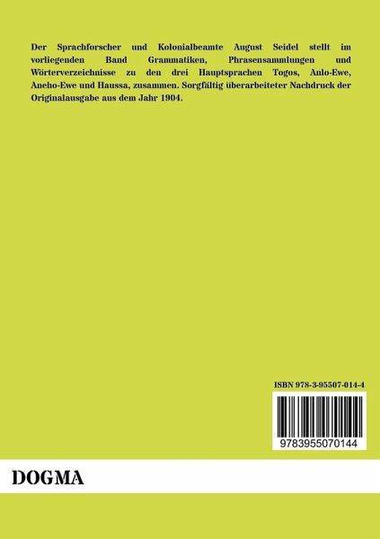 Der Sprachforscher und Kolonialbeamte August Seidel stellt im vorliegenden Band Grammatiken, Phrasensammlungen und Wörterverzeichnisse zu den drei Hauptsprachen Togos, Anlo-Ewe, Aneho-Ewe und Haussa, zusammen. Sorgfältig überarbeiteter Nachdruck der Originalausgabe aus dem Jahr 1904.