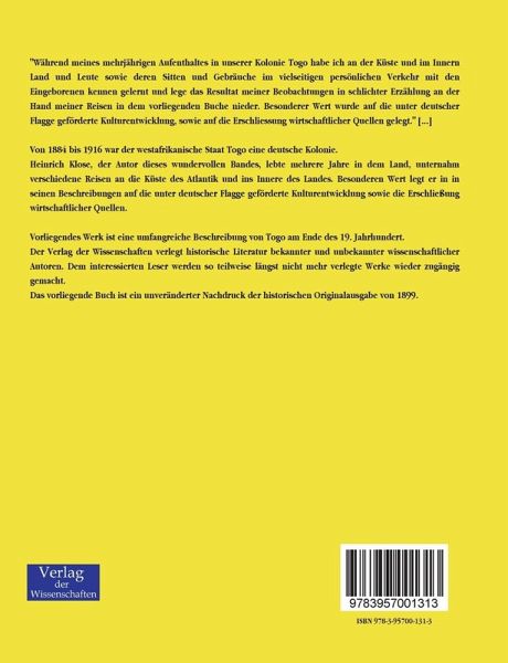 Heinrich Klose, der Autor dieses wundervollen Bandes, lebte mehrere Jahre in dem Land, unternahm verschiedene Reisen an die Küste des Atlantik und ins Innere des Landes. Besonderen Wert legt er in in seinen Beschreibungen auf die unter deutscher Flagge geförderte Kulturentwicklung sowie die Erschließung wirtschaftlicher Quellen.