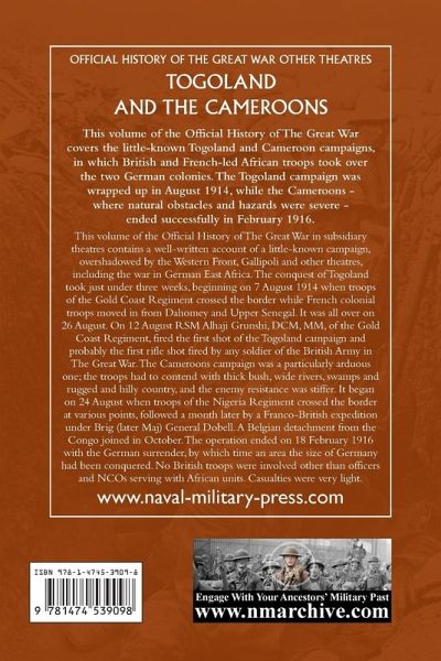 This volume of the Official History of The Great War covers the little-known Togoland and Cameroon campaigns, in which British and French-led African troops took over the two German colonies. The Togoland campaign was wrapped up in August 1914, while the Cameroons - where natural obstacles and hazards were severe - ended successfully in February 1916. This volume of the Official History of The Great War in subsidiary theatres contains a well-written account of a little-known campaign, overshadowed by the Western Front, Gallipoli and other theatres, including the war in German East Africa. The conquest of Togoland took just under three weeks, beginning on 7 August 1914 when troops of the Gold Coast Regiment crossed the border while French colonial troops moved in from Dahomey and Upper Senegal. It was all over on 26 August. On 12 August RSM Alhaji Grunshi, DCM, MM, of the Gold Coast Regiment, fired the first shot of the Togoland campaign and probably the first rifle shot fired by any soldier of the British Army in The Great War. The Cameroons campaign was a particularly arduous one; the troops had to contend with thick bush, wide rivers, swamps and rugged and hilly country, and the enemy resistance was stiffer. It began on 24 August when troops of the Nigeria Regiment crossed the border at various points, followed a month later by a Franco-British expedition under Brig (later Maj) General Dobell. A Belgian detachment from the Congo joined in October. The operation ended on 18 February 1916 with the German surrender, by which time an area the size of Germany had been conquered. No British troops were involved other than officers and NCOs serving with African units. Casualties were very light.