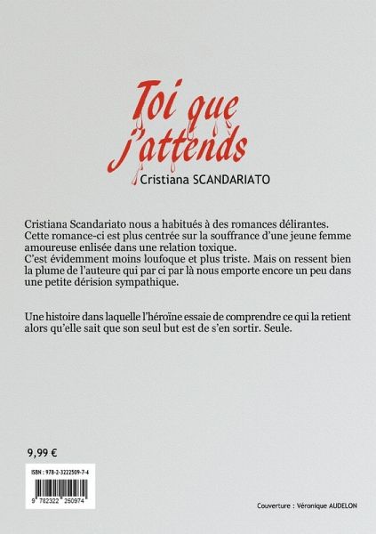 Cristiana Scandariato nous a habitués à des romances souvent délirantes. Cette romance ci est plus centrée sur la souffrance d'une jeune femme amoureuse enlisée dans une relation toxique.C'est évidemment moins loufoque et plus triste. Mais on ressent bien la plume de l'auteure qui, par ci par là, nous emporte encore un peu dans une petite dérision sympathique.Une histoire dans laquelle l'héroïne essaie de comprendre ce qui la retient alors qu'elle sait que son seul but est de s'en sortir. Seule.