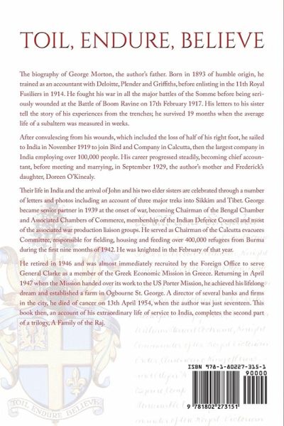 This is the second book in the Family of the Raj series. The first book covered the story of the O'Kinealy family from Co. Cavan in southern Ireland. James O'Kinealy emigrated to India arriving on 2nd February 1862 to join the Indian Civil Service. A graduate from Galway University where he had read science and engineering, he made his name as the prosecutor of the Wahabi Conspirators in 1869/70. He became a High Court Judge in the Bengal Judiciary. His eldest son Frederick studied medicine, joining the Indian Medical Service in 1891. He later became Surgeon General of Bengal and accompanied HRH Edward Prince of Wales as Chief Medical Officer to the tour party of 1921-22 to India and Burma. His detailed diaries of the tour are published for the first time. This second book is the biography of George Morton, the author's father. Born in 1893 of humble origin, he trained as an accountant with Deloitte, Plender and Griffiths, before enlisting in the 11th Royal Fusiliers in 1914. He fought his war in all the major battles of the Somme before being seriously wounded at the Battle of Boom Ravine on 17th February 1917. His letters to his sister tell the story of his experiences from the trenches; he survived 19 months when the average life of a subaltern was measured in weeks. After convalescing from his wounds, which included the loss of half of his right foot, he sailed to India in November 1919 to join Bird and Company in Calcutta, then the largest company in India employing over 100,000 people. His career progressed steadily, becoming chief accountant, before meeting and marrying, in September 1929, the author's mother and Frederick's daughter, Doreen O'Kinealy. Their life in India and the arrival of John and his two elder sisters are celebrated through a number of letters and photos including an account of three major treks into Sikkim and Tibet. George became senior partner in 1939 at the onset of war, becoming Chairman of the Bengal Chamber and Associated Chambers of Commerce, membership of the Indian Defence Council and most of the associated war production liaison groups. He served as Chairman of the Calcutta evacuees Committee, responsible for fielding, housing and feeding over 400,000 refugees from Burma during the first nine months of 1942. He was knighted in the February of that year. He retired in 1946 and was almost immediately recruited by the Foreign Office to serve General Clarke as a member of the Greek Economic Mission in Greece. Returning in April 1947 when the mission handed over its work to the US Porter Mission, he achieved his lifelong dream and established a farm in Ogbourne St. George. A director of several banks and firms in the city, he died of cancer on 13th April 1954, when the author was just seventeen. This book then, an account of his extraordinary life of service to India, completes the second part of a trilogy, A Family of the Raj. These two books cover almost the whole of the 99-year period of the Raj A third book is under preparation covering the exploits of the author's father-in-law, Lieut. Colonel R.J.F.A. Lawder, a soldier and noted climber on the North West frontier, initially with the South Waziristan Scouts and later the Kumaon Rifles. It is programmed to be completed next year.