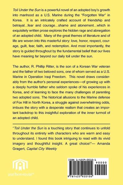 Toil Under the Sun is a powerful novel of an adopted boy's growth into manhood as a U.S. Marine during the "Forgotten War" in Korea. It is an intricately crafted account of friendship and betrayal.fear and courage.shame and atonement.which in exquisitely written prose explores the hidden rage and abnegation of an adopted child. Many of the great themes of literature and of life are woven into this masterful story: love, honor, respect, courage, guilt, fear, faith, and redemption. And most importantly, the story is guided throughout by the fundamental belief that our lives have meaning far beyond our daily toil under the sun. The author, R. Phillip Ritter, is the son of a Korean War veteran and the father of two beloved sons, one of whom served as a U.S. Marine in Operation Iraqi Freedom. This novel draws considerably from the author's personal experiences-of growing up with a deeply humble father who seldom spoke of his experiences in Korea, and of learning to face the many challenges of parenting two adopted sons. The historical allusions to the Marine defense of Fox Hill in North Korea, a struggle against overwhelming odds, imbues the story with a desperate realism that creates an important backdrop to this insightful exploration of the inner turmoil of an adopted child.