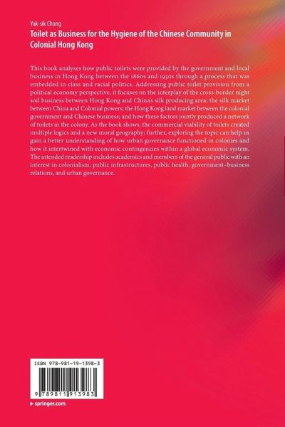 This book analyses how public toilets were provided by the government and local business in Hong Kong between the 1860s and 1930s through a process that was embedded in class and racial politics. Addressing public toilet provision from a political economy perspective, it focuses on the interplay of the cross-border night soil business between Hong Kong and China's silk producing area; the silk market between China and Colonial powers; the Hong Kong land market between the colonial government and Chinese business; and how these factors jointly produced a network of toilets in the colony. As the book shows, the commercial viability of toilets created multiple logics and a new moral geography; further, exploring the topic can help us gain a better understanding of how urban governance functioned in colonies and how it intertwined with economic contingencies within a global economic system. The intended readership includes academics and members of the general public with an interest in colonialism, public infrastructures, public health, government-business relations, and urban governance.