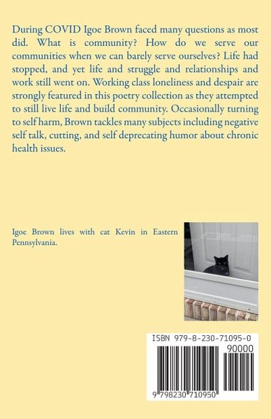During COVID Igoe Brown faced many questions about life as most did. What is community? How do we serve our communities when we can barely serve ourselves? Life had stopped, and yet life and struggle and relationships and work still went on. Working class loneliness and despair are strongly featured in this poetry collection as they attempted to still live life and build community. Occasionally turning to self harm, Brown tackles many subjects including negative self talk, cutting, and self deprecating humor about chronic health issues.