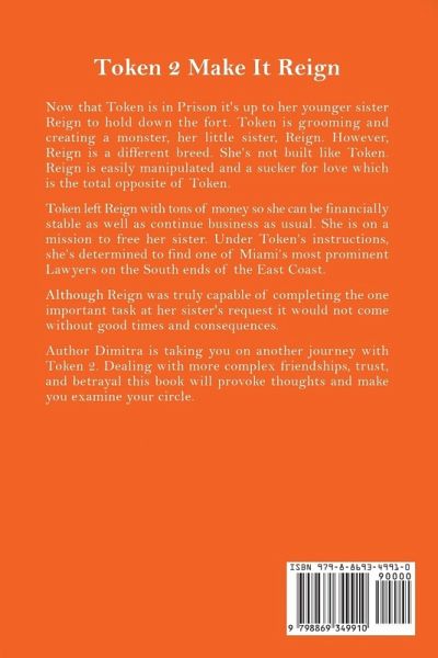 Now that Token is in Prison it's up to her younger sister Reign to hold down the fort. Token is grooming and creating a monster, her little sister, Reign. However, Reign is a different breed. She's not built like Token. Reign is easily manipulated and a sucker for love which is the total opposite of Token. Token has left Reign with tons of money so she can be financially stable as well as continue business as usual. She is on a mission to free her sister. Under Token's instructions, she's determined to find one of Miami's most prominent Lawyers on the South end of the East Coast. Although Reign was truly capable of completing the one important task at her sister's request it would not come without good times and consequences. Author Dimitra is taking you on another journey with Token 2. Dealing with more complex friendships, trust, and betrayal this book will provoke thoughts and make you examine your circle.
