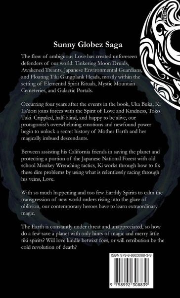 The flow of ambiguous Love has created unforeseen defenders of our world: Tinkering Moon Druids, Awakened Treants, Japanese Environmental Guardians, and Floating Tiki Gangplank Heads, mostly within the setting of Elemental Spirit Rituals, Mystic Mountain Cemeteries, and Galactic Portals. Occurring four years after the events in the book, Uka Buka, Ki La'dori joins forces with the Spirit of Love and Kindness, Toko Tuki. Crippled, half-blind, and happy to be alive, our protagonist's overwhelming emotions and newfound power begin to unlock a secret history of Mother Earth and her magically imbued descendants. Between assisting his California friends in saving the planet and protecting a portion of the Japanese National Forest with old school Monkey Wrenching tactics, Ki works through how to fix these dire problems by using what is relentlessly racing through his veins, Love. With so much happening and too few Earthly Spirits to calm the transgression of new world orders rising into the glare of oblivion, our contemporary heroes have to learn extraordinary magic. The Earth is constantly under threat and unappreciated, so how do a few save a planet with only hints of magic and merry little tiki spirits? Will love kindle betwixt foes, or will retribution be the cold revolution of death?