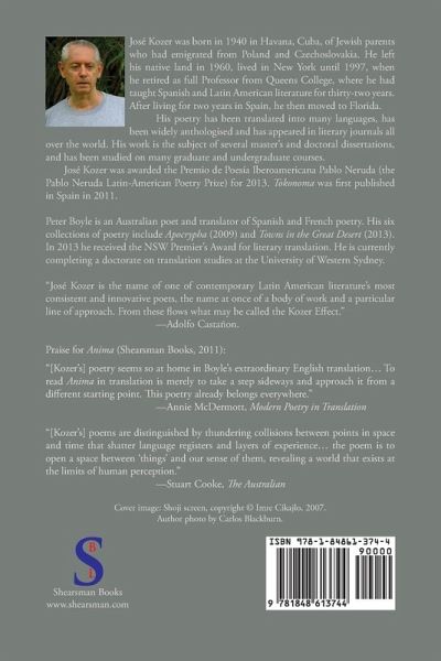 José Kozer was born in 1940 in Havana, Cuba, of Jewish parents who had emigrated from Poland and Czechoslovakia. He left his native land in 1960, lived in New York until 1997, when he retired as full Professor from Queens College, where he had taught Spanish and Latin American literature for thirty-two years. After living for two years in Spain, he then moved to Florida. His poetry has been translated into many languages, has been widely anthologised and has appeared in literary journals all over the world. His work is the subject of several master's and doctoral dissertations, and has been studied on many graduate and undergraduate courses. José Kozer was awarded the Premio de Poesía Iberoamericana Pablo Neruda (the Pablo Neruda Latin-American Poetry Prize) for 2013. Tokonoma was first published in Spain in 2011.