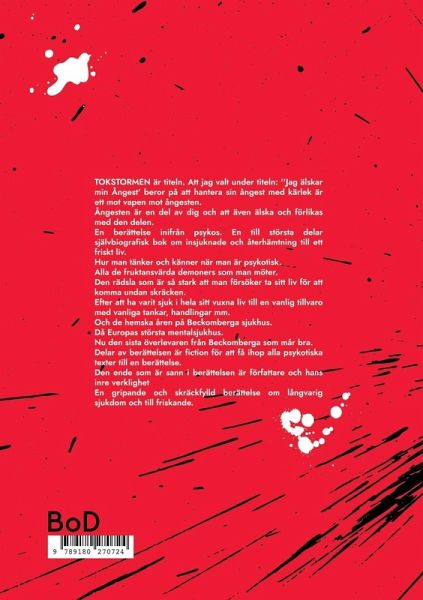 TOKSTORMEN är titeln. Att jag valt under titeln: ''Jag älskar min Ångest' beror på att hantera sin ångest med kärlek är ett mot vapen mot ångesten. Ångesten är en del av dig och att även älska och förlikas med den delen. En berättelse inifrån psykos. En till största delar självbiografisk bok om insjuknade och återhämtning till ett friskt liv. Hur man tänker och känner när man är psykotisk. Alla de fruktansvärda demoners som man möter. Den rädsla som är så stark att man försöker ta sitt liv för att komma undan skräcken. Efter att ha varit sjuk i hela sitt vuxna liv till en vanlig tillvaro med vanliga tankar, handlingar mm. Och de hemska åren på Beckomberga sjukhus. Då Europas största mentalsjukhus. Nu den sista överlevaren från Beckomberga som mår bra. Delar av berättelsen är fiction för att få ihop alla psykotiska texter till en berättelse. Den ende som är sann i berättelsen är författare och hans inre verklighet En gripande och skräckfylld berättelse om långvarig sjukdom och till friskande.