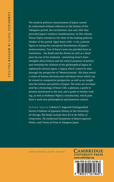 The modern political consciousness of Japan cannot be understood without reference to the history of the Tokugawa period, the era between 1600 and 1868 that preceded Japan's modern transformation. Tetsuo Najita introduces the ideas of the leading political thinker of the period, Ogyu Sorai (1666-1728), a pivotal figure in laying the conceptual foundations of Japan's modernization. His basic thoughts about history and the ethical purposes of politics are presented, revealing the richness of the philosophical legacy of eighteenth-century Japan, a legacy which cannot be seen through the perspective of 'westernization'. His ideas reveal a vision of human diversity and individual virtue which can be viewed in comparative perspective, as well as an insight into the history and politics of Japan. The texts are accompanied by a chronology of Sorai's life, a glossary, a guide to persons mentioned in the text, and a guide to further reading, as well as Professor Najita's introduction, which puts Sorai's work into philosophical and historical context.