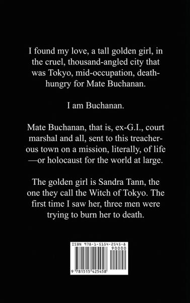 I found my love, a tall golden girl, in the cruel, thousand-angled city that was Tokyo, mid-occupation, death-hungry for Mate Buchanan. I am Buchanan. Mate Buchanan, that is, ex-G.I., court marshal and all, sent to this treacherous town on a mission, literally, of life-or holocaust for the world at large. The golden girl is Sandra Tann, the one they call the Witch of Tokyo. The first time I saw her, three men were trying to burn her to death.