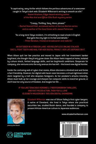 An outsider in a foreign land. Her ruthless cyberstalker. She'll fight tooth and nail for her digital privacy. Her life depends on it. Tokyo, the '90s When Alison Crane quit her environmental law practice and followed her hotshot investment banker boyfriend to Japan, she thought they'd only grow closer. But jobless and broke, Alison sits home alone all day-and most nights-isolated by culture shock, wobbly language skills, and her boyfriend's ambitions. Desperate for company, she ventures onto the only avenue she has left-the brand-new digital frontier. Inside the confusing web of cyber chat rooms, Alison is approached by a charming Japanese man, and the two regularly meet online. But her digital safe haven soon becomes a virtual nightmare when a troll who despises foreigners taunts her with escalating threats of violence. As her predator's attacks intensify, Alison must parlay her legal smarts and budding computer skills to stand her ground, or she'll lose her only source of freedom. And maybe her life... Tokyo Firewall crackles with the energy of the '90s, a time of dial-up modems and floppy disks, an era when the internet was an unruly free-for-all where lawlessness reigned. Protagonist Alison Crane's technological misadventures foreshadow issues grabbing headlines now-digital privacy, cyberterrorism, hacking, and online misogyny. If you like steamy suspense and fast-paced action, then you'll love Elizabeth Wilkerson's '90s-era digital free-for-all. Buy Tokyo Firewall to log on to an electrifying tale of defiance and self-discovery today!