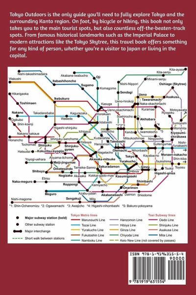 Tokyo Outdoors is the only guide you'll need to fully explore Tokyo and the surrounding Kanto region. On foot, by bicycle or hiking, this book not only takes you to the main tourist spots, but also countless off-the-beaten-track spots. From famous historical landmarks such as the Imperial Palace to modern attractions like the Tokyo Skytree, this travel book offers something for any kind of person, whether you're a visitor to Japan or living in the capital. Fully up-to-date, Tokyo Outdoors contains:45 walks, cycling rides and hikes in and near Tokyo, Hundreds of insider tips from a writer who has lived in the city for more than 10 years, 12 day trips that include Yokohama, Nikko, Kamakura, Enoshima and Karuizawa, More than 40 detailed print maps, Online maps included for use on the go, with additional recommendations for food and drink, shopping, temples and shrines, 110+ photos offer an impression of the amazing sights you'll visit, Recommended restaurants and cafes, A simplified Tokyo subway map, Super easy to use with a train pass, as each itinerary starts and ends at a railway station, Festivals and events calendar, based on locations in the book, Lists of the best cherry blossom and autumn leaves spots, Top 5 lists for various interests, such as history, culture, shopping, art and museums.