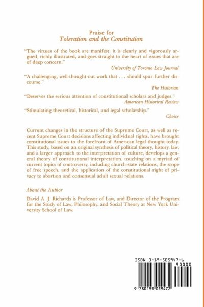 Why have the issues of religious liberty, free speech and constitutional privacy come to figure so prominently in our society? What are the origins of the basic principles of our constitutional law? This work develops a general theory of constitutional interpretation based on an original synthesis of political theory, history, law, and a larger approach to the interpretation of culture. Presenting both historical and theoretical arguments in support of a theory that affirms the moral sovereignty of the people, Richards maintains that toleration, or respect for conscience and individual freedom, is the central constitutional ideal. He discusses such current topics of constitutional controversy as church-state relations, the scope of free speech, and the application of the constitutional right to privacy, to abortion, and consensual adult sexual relations.