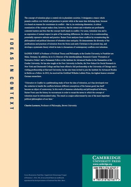 Introduction Part I. Between Power and Morality: The Historical Discourse of Toleration: 1. Toleration: concept and conceptions 2. More than a prehistory: Antiquity and the Middle Age 3. Reconciliation, schism, peace: humanism and the Reformation 4. Toleration and sovereignty: political and individual 5. Natural law, toleration and revolution: the rise of liberalism and the aporias of freedom of conscience 6. The Enlightenment - for and against toleration 7. Toleration in the modern era 8. Routes to toleration Part II. A Theory of Toleration: 9. The justification of toleration 10. The finitude of reason 11. The virtue of tolerance 12. The tolerant society.