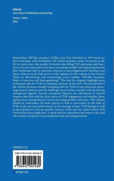 Mammalian Toll-like receptors (TLRs) were first identified in 1997 based on their homology with Drosophila Toll, which mediates innate immunity in the fly. In recent years, the number of studies describing TLR expression and function in the nervous system has been increasing steadily and expanding beyond their traditional roles in infectious diseases to neurodegenerative disorders and injury. Interest in the field serves as the impetus for this volume in the Current Topics in Microbiology and Immunology series entitled "Toll-like receptors: Roles in Infection and Neuropathology". The first five chapters highlight more traditional roles for TLRs in infectious diseases of the CNS. The second half of the volume discusses recently emerging roles for TLRs in non-infectious neurodegenerative diseases and the challenges faced in these models with identifying endogenous ligands. Several conceptual theories are introduced in various chapters that deal with the dual nature of TLR engagement and whether these signals favor neuroprotective versus neurodegenerative outcomes. This volume should be informative for both experts as well as newcomers to the field of TLRs in the nervous system based on its coverage of basic TLR biology as well as specialization to discuss specific diseases of the nervous system where TLR function has been implicated. A must read for researchers interested in the dual role of these receptors in neuroinfection and neurodegeneration.