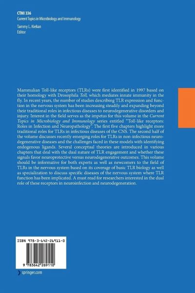 Mammalian Toll-like receptors (TLRs) were first identified in 1997 based on their homology with Drosophila Toll, which mediates innate immunity in the fly. In recent years, the number of studies describing TLR expression and function in the nervous system has been increasing steadily and expanding beyond their traditional roles in infectious diseases to neurodegenerative disorders and injury. Interest in the field serves as the impetus for this volume in the Current Topics in Microbiology and Immunology series entitled "Toll-like receptors: Roles in Infection and Neuropathology". The first five chapters highlight more traditional roles for TLRs in infectious diseases of the CNS. The second half of the volume discusses recently emerging roles for TLRs in non-infectious neurodegenerative diseases and the challenges faced in these models with identifying endogenous ligands. Several conceptual theories are introduced in various chapters that deal with the dual nature of TLR engagement and whether these signals favor neuroprotective versus neurodegenerative outcomes. This volume should be informative for both experts as well as newcomers to the field of TLRs in the nervous system based on its coverage of basic TLR biology as well as specialization to discuss specific diseases of the nervous system where TLR function has been implicated. A must read for researchers interested in the dual role of these receptors in neuroinfection and neurodegeneration.