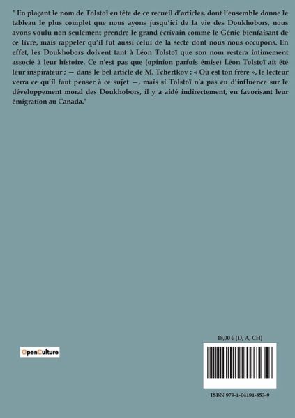 "Tolstoï et les Doukhobors" est une uvre collective qui rassemble les écrits de Léon Tolstoï, Paul Birukov, Vladimir Tchertkov et J.-Wladimir Bienstock, publiée en 1902. Ce livre explore la communauté des Doukhobors, un groupe religieux pacifiste originaire de Russie, à travers divers essais, lettres et documents officiels. La table des matières révèle une structure détaillée, commençant par un avertissement du traducteur et une préface de Paul Birukov. Les premiers chapitres décrivent l'origine, la vie, l'organisation et la doctrine des Doukhobors au début du XIXe siècle, basés sur un rapport officiel de 1805. Paul Birukov partage ensuite sa propre expérience avec les Doukhobors, tandis que Tolstoï contribue par une lettre adressée au Times et une postface à la brochure de Birukov. Les persécutions subies par les Doukhobors en Russie en 1895 sont également abordées, soulignant les défis auxquels ils ont été confrontés. Le livre traite ensuite de l'émigration des Doukhobors au Canada, avec des lettres de Tolstoï adressées à ceux qui ont émigré, et examine les interactions entre les Doukhobors et le gouvernement canadien. L'ouvrage se termine par un appendice, offrant une vue d'ensemble des efforts de Tolstoï et de ses contemporains pour soutenir cette communauté persécutée. À travers ces écrits, les auteurs mettent en lumière les valeurs de paix et de résistance non-violente des Doukhobors, tout en critiquant les injustices qu'ils ont subies.