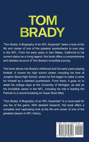 Introducing: "Tom Brady: A Biography of an NFL Superstar" Get ready to dive into the life of the most accomplished and celebrated quarterback in NFL history! Discover the untold story of Tom Brady in this captivating biography, which takes you on a journey through his life, from his humble beginnings to his meteoric rise as an NFL legend. In "Tom Brady: A Biography of an NFL Superstar," you'll uncover the passion, perseverance, and hard work that has driven him to achieve unparalleled success in the world of professional football. Why This Book is a Must-Read for Every Football Fan: Exclusive Insights Into Brady's Life: Explore the early years of his upbringing and see how he developed his love for football. Understand the key moments in his high school career that helped mold him into the player he is today. College Career: Unravel the story of his time at the University of Michigan, where he honed his skills and developed the mental toughness that would become his trademark. A Legendary NFL Career: Relive the incredible highlights of his time with the New England Patriots and Tampa Bay Buccaneers. Understand how he led his teams to victory in multiple Super Bowls, securing his place in the annals of NFL history. Personal Life: Get a glimpse into Tom Brady's life outside of football. Learn about his family life, fatherhood, philanthropy, and his commitment to a healthy lifestyle. A Source of Inspiration: Be inspired by his unwavering dedication, laser-focused mindset, and the lessons you can learn from his journey to greatness.