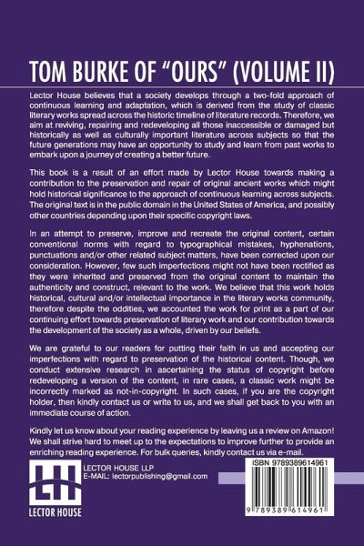 Tom Burke Of "Ours" (Volume II): In Two Volumes, Vol. II. This book is a result of an effort made by us towards making a contribution to the preservation and repair of original classic literature. In an attempt to preserve, improve and recreate the original content, we have worked towards: 1. Type-setting & Reformatting: The complete work has been re-designed via professional layout, formatting and type-setting tools to re-create the same edition with rich typography, graphics, high quality images, and table elements, giving our readers the feel of holding a 'fresh and newly' reprinted and/or revised edition, as opposed to other scanned & printed (Optical Character Recognition - OCR) reproductions. 2. Correction of imperfections: As the work was re-created from the scratch, therefore, it was vetted to rectify certain conventional norms with regard to typographical mistakes, hyphenations, punctuations, blurred images, missing content/pages, and/or other related subject matters, upon our consideration. Every attempt was made to rectify the imperfections related to omitted constructs in the original edition via other references. However, a few of such imperfections which could not be rectified due to intentional\unintentional omission of content in the original edition, were inherited and preserved from the original work to maintain the authenticity and construct, relevant to the work. We believe that this work holds historical, cultural and/or intellectual importance in the literary works community, therefore despite the oddities, we accounted the work for print as a part of our continuing effort towards preservation of literary work and our contribution towards the development of the society as a whole, driven by our beliefs. We are grateful to our readers for putting their faith in us and accepting our imperfections with regard to preservation of the historical content. HAPPY READING!