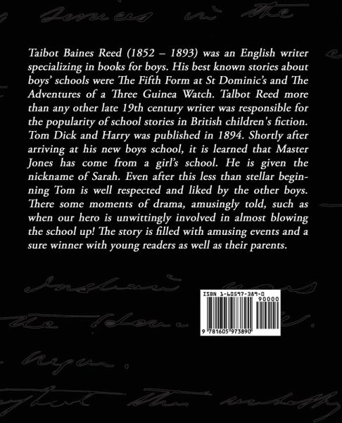 Tailbot Baines Reed (1852 - 1893) was an English writer specializing in books for boys. His best known stories about boys' schools were The Fifth Form at St Dominic's and The Adventures of a Three Guinea Watch. Talbot Reed more than any other late 19th century writer was responsible for the popularity of school stories in British children's fiction. Tom Dick and Harry was published in 1894. Shortly after arriving at his new boys school, it is learned that Master Jones has come from a girl's school. He is given the nickname of Sarah. Even after this less than stellar beginning Tom is well respected and liked by the other boys. There some moments of drama, amusingly told, such as when our hero is unwittingly involved in almost blowing the school up! The story is filled with amusing events and a sure winner with young readers as well as their parents.