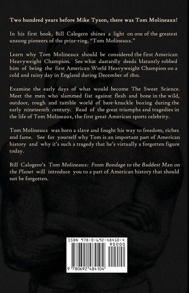 Two hundred years before Mike Tyson, there was Tom Molineaux! In his first book, Bill Calogero shines a light on one of the greatest unsung pioneers of the prize-ring, "Tom Molineaux. Learn why Tom Molineaux should be considered the first American Heavyweight Champion. See what dastardly deeds blatantly robbed him of being the first American World Heavyweight Champion on a cold and rainy day in England during December of 1810. Examine the early days of what would become The Sweet Science. Meet the men who slammed fist against flesh and bone in the wild, outdoor, rough and tumble world of bare-knuckle boxing during the early nineteenth century. Read of the great triumphs and tragedies in the life of Tom Molineaux, the first great American sports celebrity. Tom Molineaux was born a slave and fought his way to freedom, riches and fame. See for yourself why Tom is an important part of American history and why it's such a tragedy that he's virtually a forgotten figure today. Bill Calogero's "Tom Molineaux: From bondage to the baddest man on the planet" will introduce you to a part of American history that should not be forgotten.